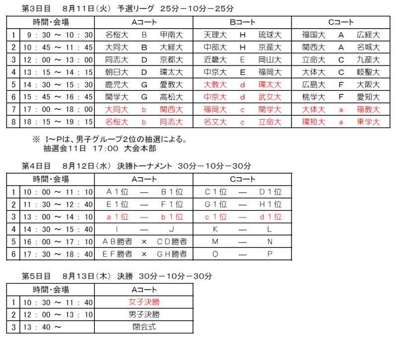 各組 1 2 3 4 aブロック 大阪体育大学(関西学連) 福岡教育大学(九州学連) 環太平洋大学短期大学部(中四国学連) 東海学園大学(東海学連) bブロック 大同大学(東海学連) 関西大学(関西学連) 名桜大学(九州学連) 同志社大学(関西学連) cブロック 福岡大学(九州学連) 関西学院大学(関西学連) 名古屋文理大学(東海学連) 立命館大学(関西学連) dブロック 大阪教育大学(関西学連) 環太平洋大学(中四国学連) 中京大学(東海学連) 武庫川女子大学(関西学連)